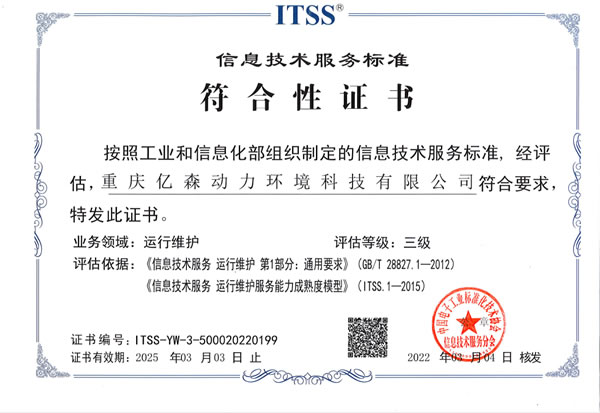 不僅如此,除專利外,經ITSS協會審核確認,億森動力順利取得ITSS三級認證證書,此項認證的成功,標志著億森動力在信息技術服務標準和能力上又邁出了堅實的一步。